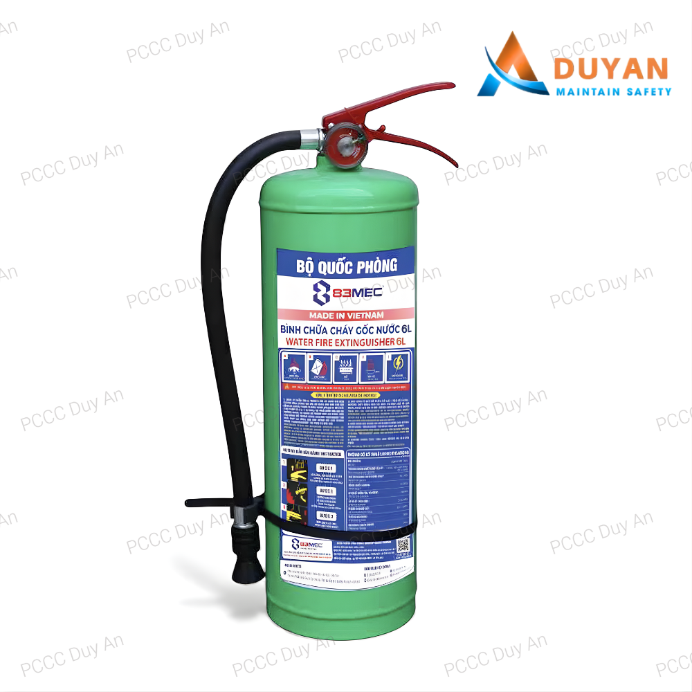 Với hiệu quả dập lửa nhanh, an toàn và thân thiện với môi trường, bình chữa cháy gốc nước 6L Bộ Quốc Phòng 83MEC là giải pháp PCCC phù hợp cho gia đình, văn phòng, cửa hàng và nhiều công trình khác.